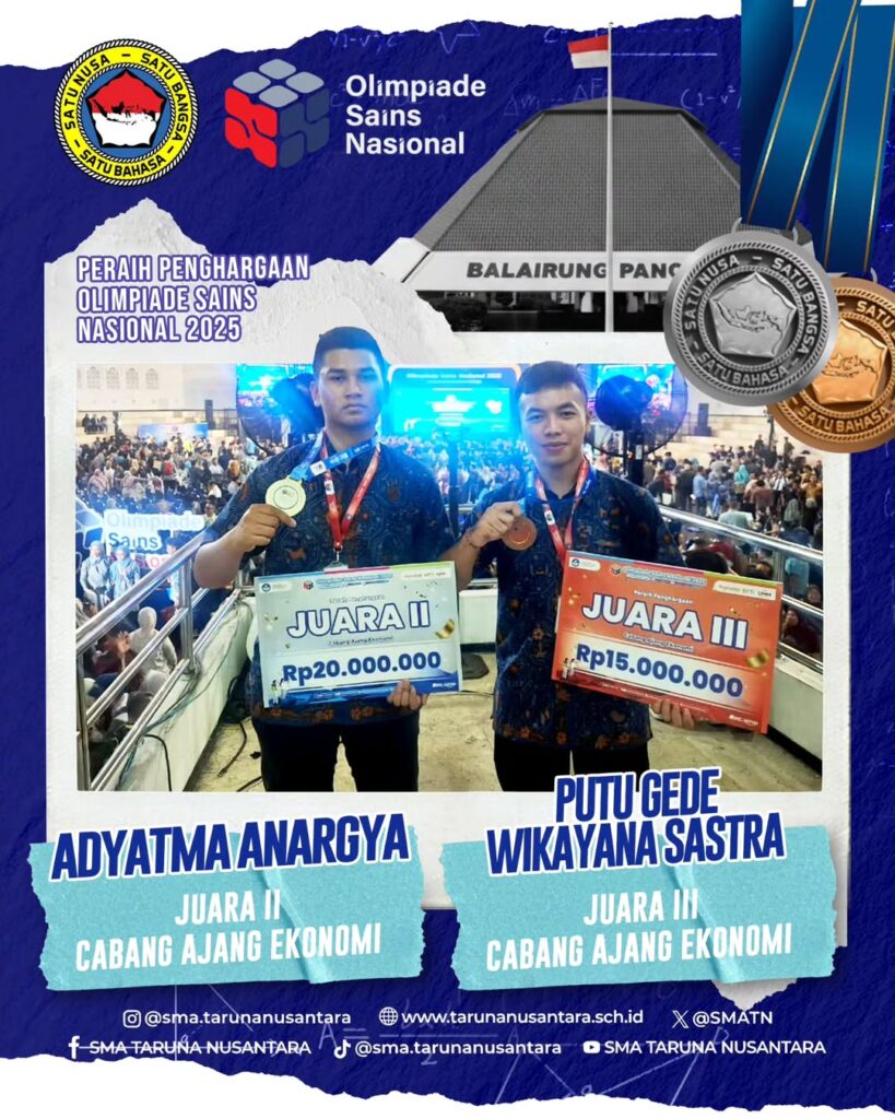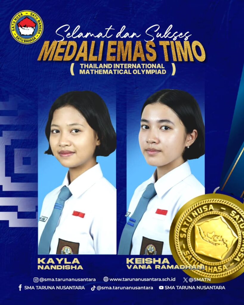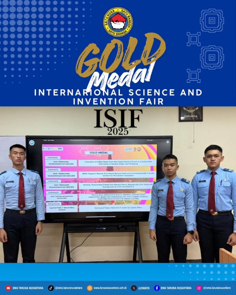 Siswa kelas XII SMA Taruna Nusantara Magelang berhasil meraih gold medal (medali emas) di International Science and Invention Fair (ISIF) 2025 yang diselenggarakan oleh Indonesian Young Scientist Association(IYSA). 6 Siswa Peraih Medali Emas ISIF Tim peneliti SMA TN beranggotakan enam Siswa, yaitu:1. Fachri Aulia Ziaulhaq Azhim / XII-A4 @fachri__ii2. Zabran Maika Ariwibowo / XII-A1 @zbrn_m.a3. Raditya Dwi