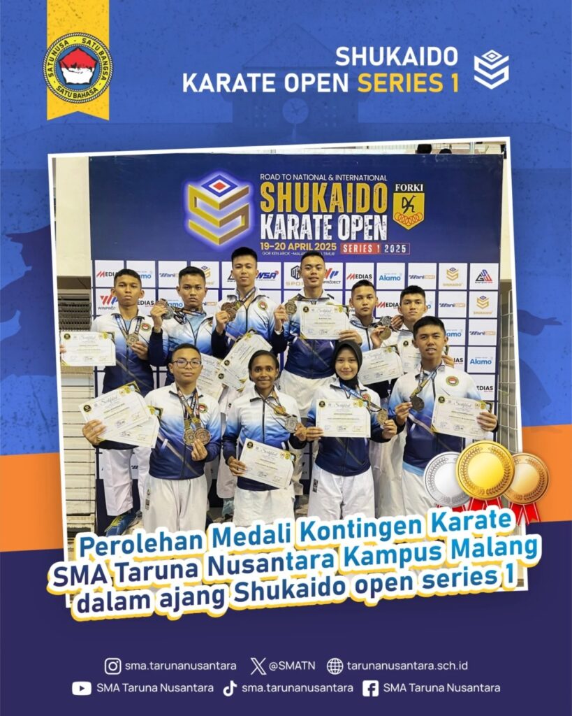 Semangat juang, disiplin yang tinggi dan mental yang kuat kembali menghantarkan siswa SMA Taruna Nusantara kampus Malang meraih kemenangan dalam Kompetisi Karate Dalam Ajang Shukaido Open Series 1 bertempat di Gor Ken Arok, Malang pada 19-20 April 2025.