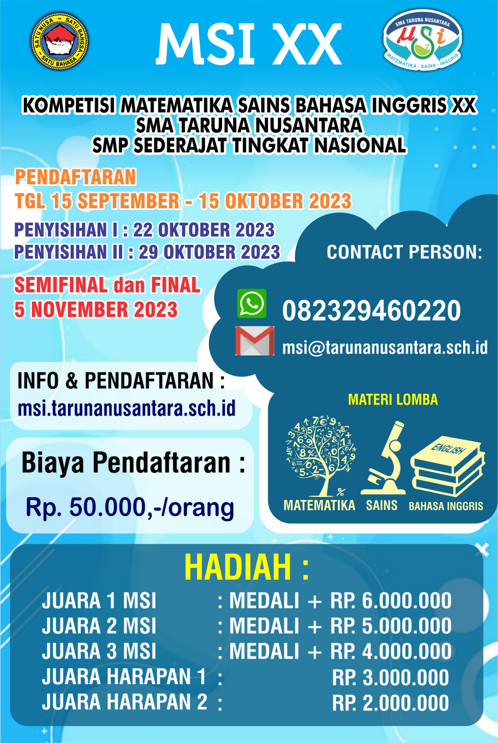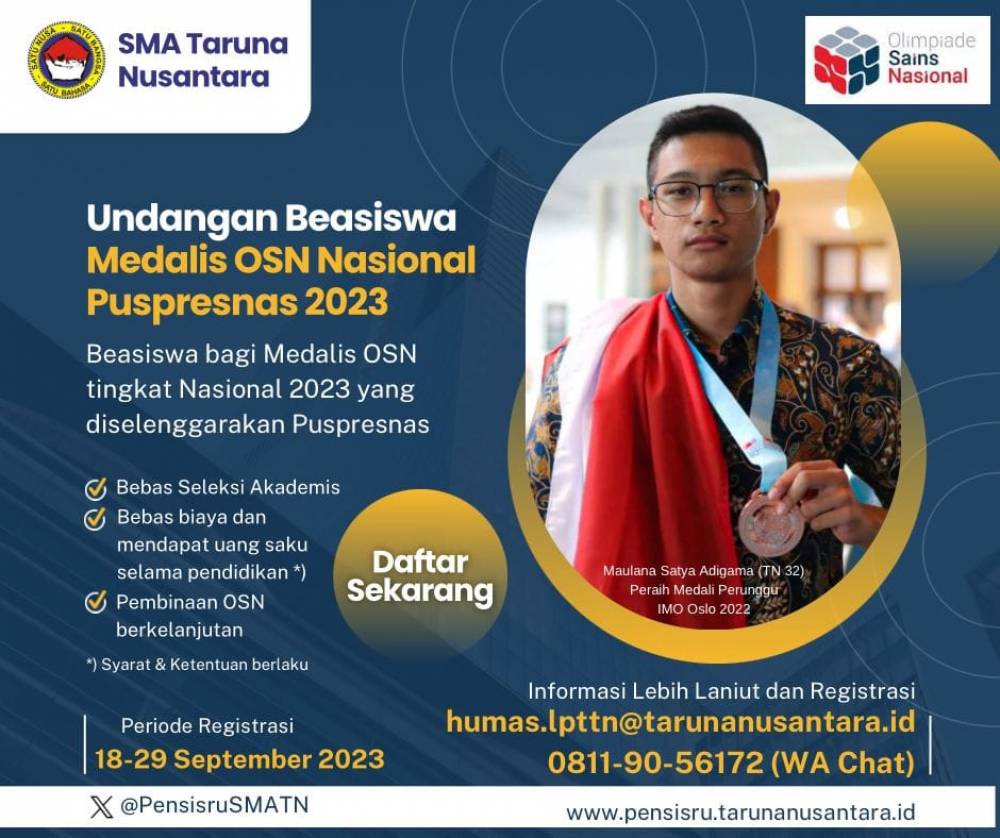 Kompetisi Matematika, Sains dan Inggris adalah kompetisi tahunan tingkat nasional yang melombakan ratusan hingga ribuan siswa SMP/Sederajat dari seluruh Indonesia. Tahun 2023 adalah penyelenggaraan yang ke-20 dan SMA Taruna Nusantara membuka lebih banyak peserta untuk berpartisipasi secara daring. MSI menjadi kompetisi yang menguji tidak hanya pengetahuan kognitif, namun juga keterampilan praktik dan problem-solving, serta sekaligus […]
