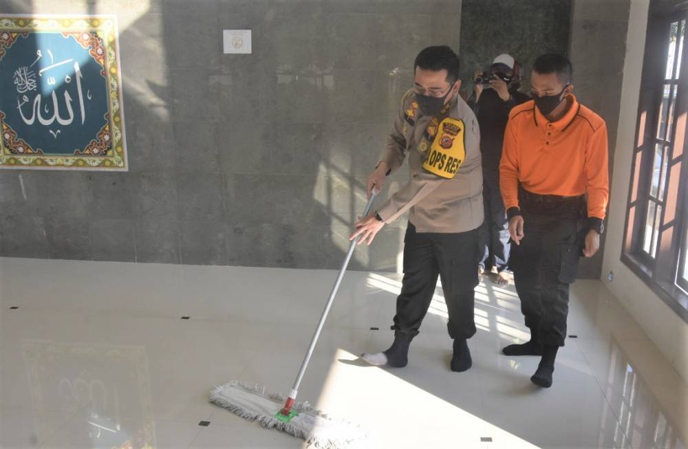 Kapolres Bogor AKBP Roland Ronaldy bersama Polsek jajarannya selain melakukan penempelan brosur sosialisasi himbauan mengenai pedoman dalam masa New Normal, pemberian bantuan sosial kepada warga masyarakat, turut melakukan kegiatan bersih-bersih mesjid di lingkungan kantor dan di lingkungan sekitar.