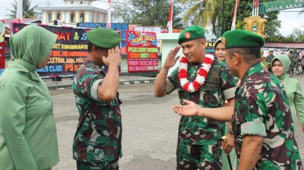 Penerimaan Letkol Arh Helmy Ariansyah SE sebagai Komandan Kodim 0107/Asel yang baru ini di terima oleh perwira tertua Pasi Ops Kodim 0107/Asel, Kapten Arh Rahman.