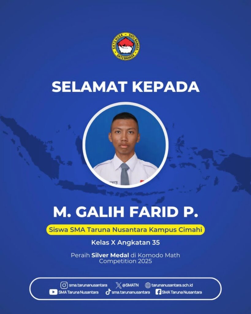 Kabar membanggakan datang dari SMA Taruna Nusantara Kampus Cimahi, salah satu siswanya M. Galih Farid P (Kelas X-2 Angkatan 35) berhasil meraih Medali Perak (Silver Medal) dalam ajang bergengsi Komodo Math Competition (KMC) 2025, sebuah kompetisi internasional yang mempertemukan pelajar-pelajar unggulan dalam bidang matematika.