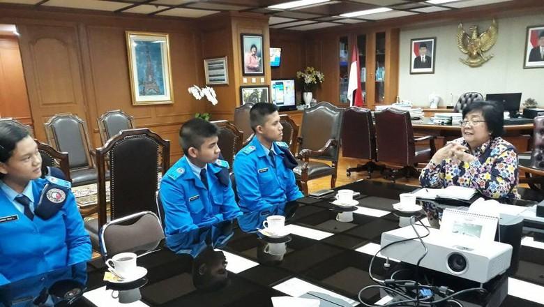 Ketiga siswa ini bernama Andira Mega L, Andi Adhyaksa dan Muhammad Daffa Nur. Pertemuan digelar di ruang kerja Menteri Siti di lantai 4 Gedung Manggala Wanabhakti, Jakarta, Rabu (20/12/2017).