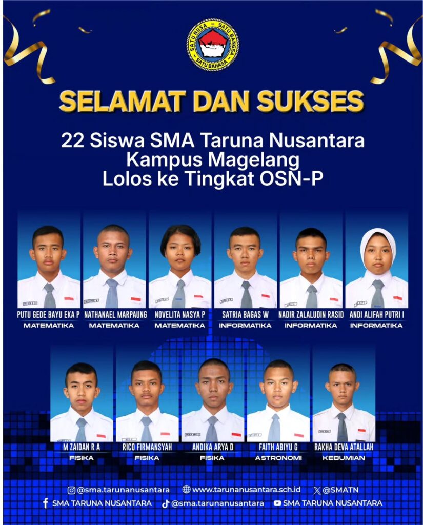 Mewakili Sekolah dan Daerah di Olimpiade Sains Nasional Tingkat Provinsi Jawa Tengah Magelang, 19 Juli 2025 – SMA Taruna Nusantara kembali menunjukkan komitmennya dalam dunia sains dan pendidikan. Sebanyak 22 siswa terbaik kelas XI dan XII secara resmi mewakili sekolah untuk mengikuti Olimpiade Sains Nasional Tingkat Provinsi (OSN-P) Jawa Tengah yang diselenggarakan pada 19–21 Juli