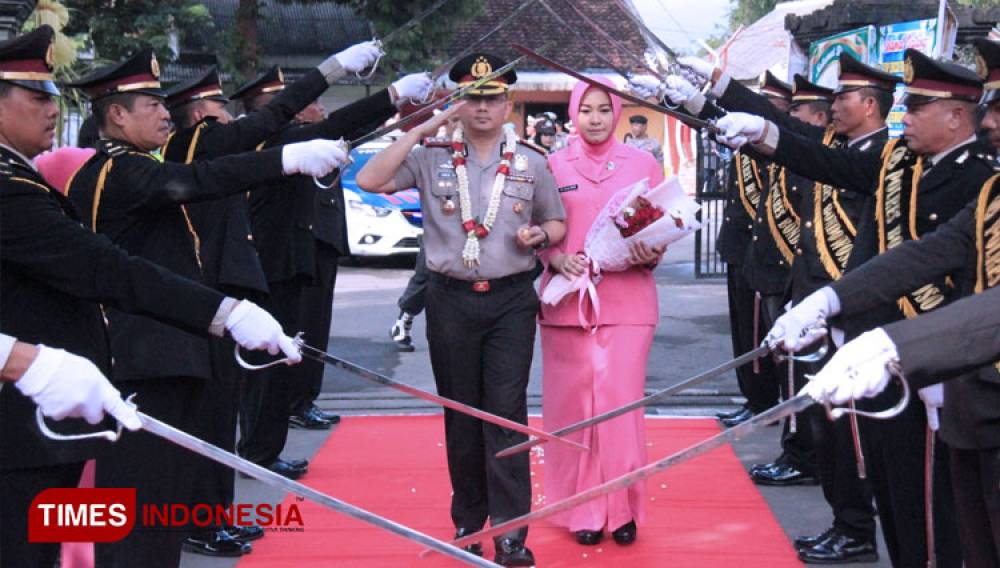 TIMESBANYUWANGI, BONDOWOSO – Kedatangan Kapolres Bondowoso yang baru, AKBP Erick Frendiz, disambut dengan tradisi pedang pora, di halaman Mapolres setempat, Senin (17/2/2020).